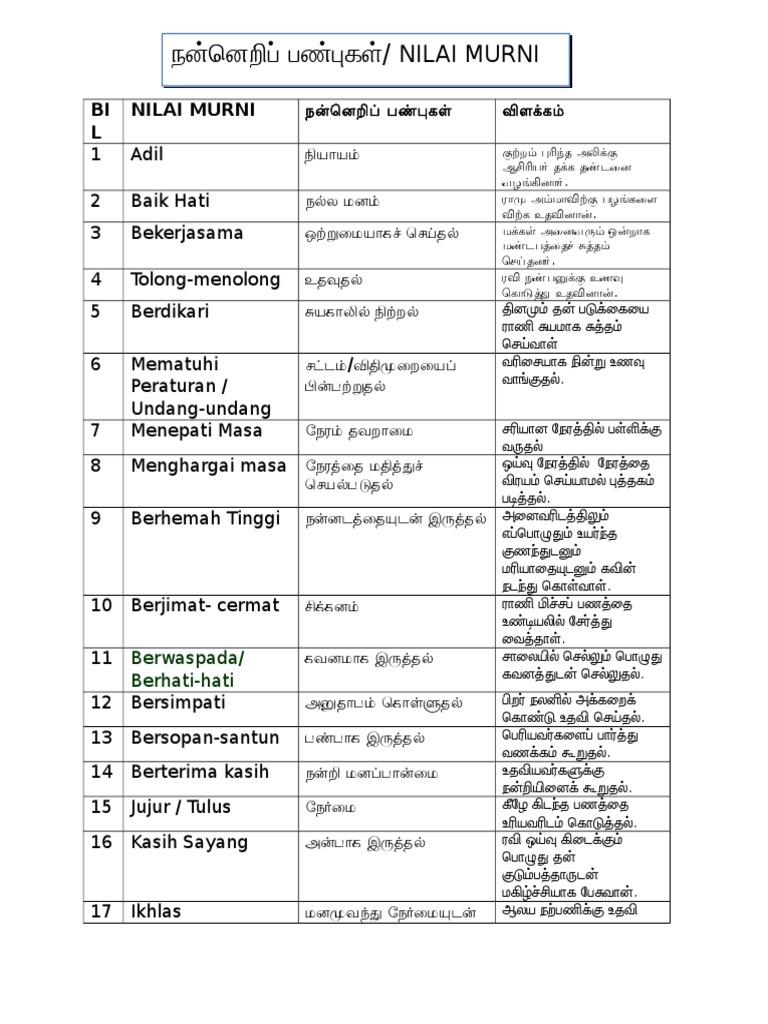 Para pelajar digalak memuat turun, memahami dan menghafalkan semua kata kunci di dalam setiap penerangan nilai, supaya dapat mencapai keputusan yang cemerlang dalam peperiksaan. Nilai murni pendidikan moral bidang pembelajaran 1 : Pengertian nilai moral menurut para ahli, jenis, dan contohnya dalam keseharian baca di web dosensosiologi.com. Semua sifat itu perlu dipupuk sejak kecil lagi. Kepekaan kpd keperluan dan kebajikan diri dan orang lain dgn memberikan bantuan serta sokongan moral yg ikhlas.