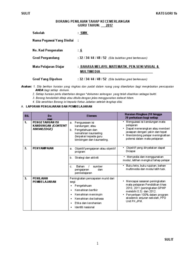 Borang hendaklah ditaip atau ditulis dengan jelas menggunakan dakwat hitam. Kategori 1a ( untuk gred 29 dan 41/42 ) pdf klik di sini. Dapat menjelaskan konsep / fakta atau memberi jawapan dengan yakin, jelas dan tepat. Mulai julai 2013, penilaian tahap kecemerlangan dikuat kuasakan selaras dengan surat jabatan perkhidmatan awam malaysia jpa. Sulit rumusan penilaian tahap kecemerlangan (markah diisi oleh panel penilai) panel penilai dikehendaki memberikan penilaian menggunakan skala 1 hingga 10 seperti di documents similar to borang penilaian tahap kecemerlangan guru dg44.
